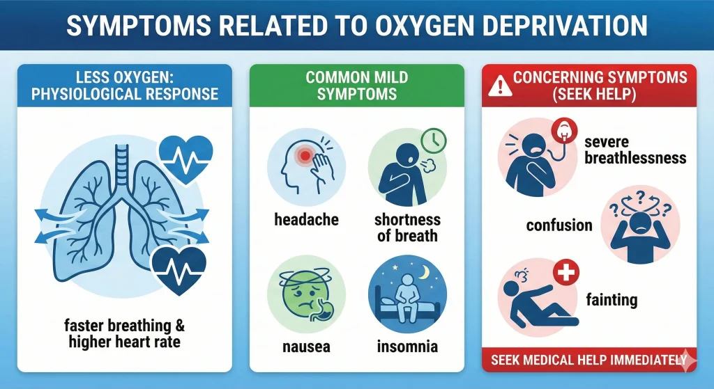 - Less oxygen: faster breathing & higher heart rate.