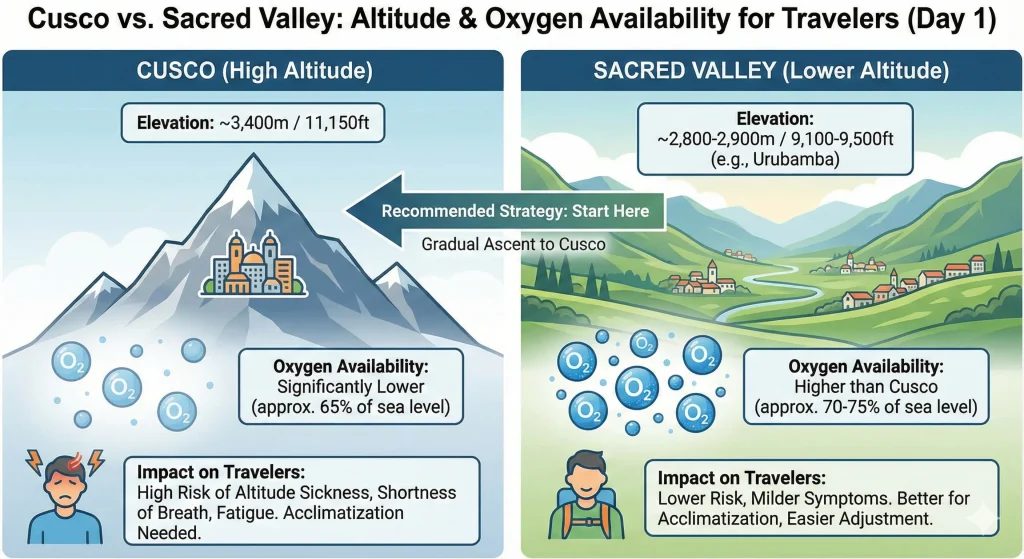 This guide compares two perfect Day-1 options: the Sacred Valley (1-day) and the Cusco City Tour (half-day). It explains how to use them (plus a few gentle activities) to acclimatize smarter. Read this before you book or step out of your hotel.